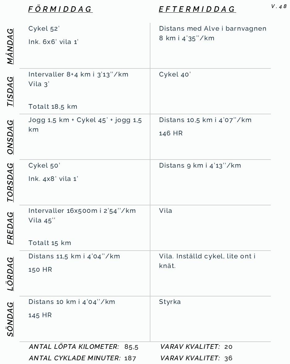 Mycket upp och ner som vanligt under dessa 5 veckor. Det som var upp var att löpningen flöt på fint samt att jag återigen nu har möjlighet till smidig träning på Airbiken. Jag närmade mig full volym och intensitet. Det som var ner var att jag fick ont i knät från all träning på den vanliga stationära cykeln. Med nya spinning-skor (hatar den benämningen) blev träningen mer effektiv, men samtidigt blev den nya belastningen för stor för snabbt. Sedan blev jag sjuk. Ett riktigt dåligt slut på året.