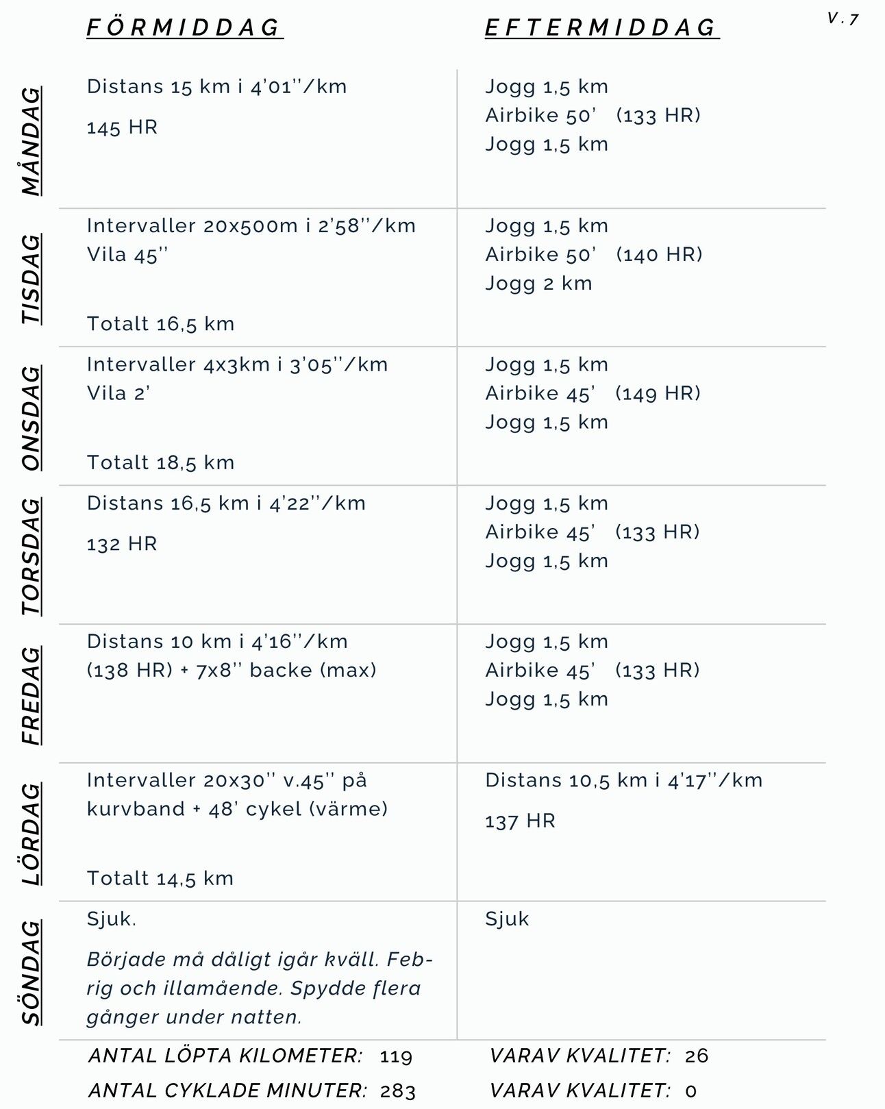 Dessa träningsveckor kommer jag inte bemöda mig att kommentera mer ingående. Perioden blev en besvikelse och jag vill inte dra mig själv genom skiten igen. Men jag ger några punkter att utgå ifrån: